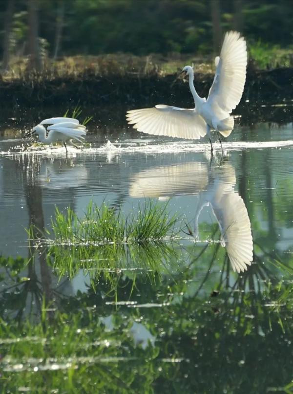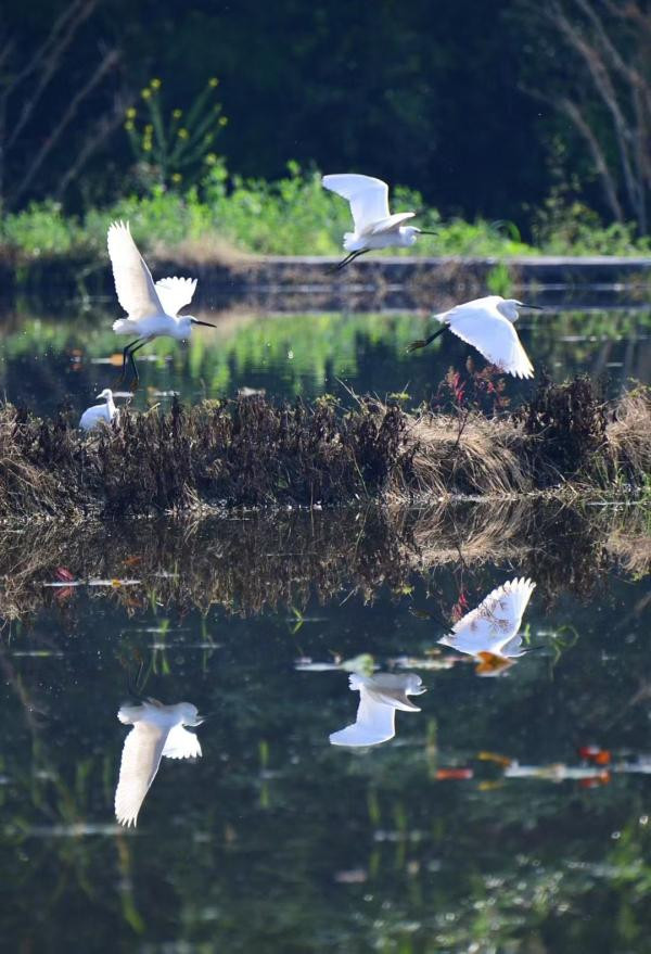 得益于优良的生态环境,每年4月,白鹭都会陆续来到大围山镇停留、玩耍、觅食,恋恋不愿离去,七八月荷花盛放时还能看到它们的身影。