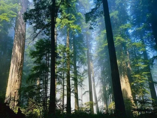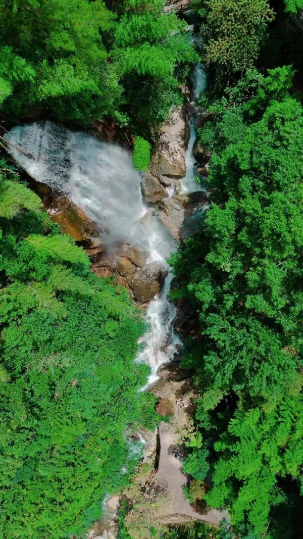 顺着水流而下,沿途的杉林、巨石、石涧组成湖南独有的第四纪冰川遗迹。枫林瀑布从山上涌下,当一颗颗晶莹剔透的水珠与阳光相遇,唯美无比的丁达尔现象便出现了。登至七星岭,远山连绵青翠,云雾缭绕山间,“一览众山小”的开阔之感油然而生。