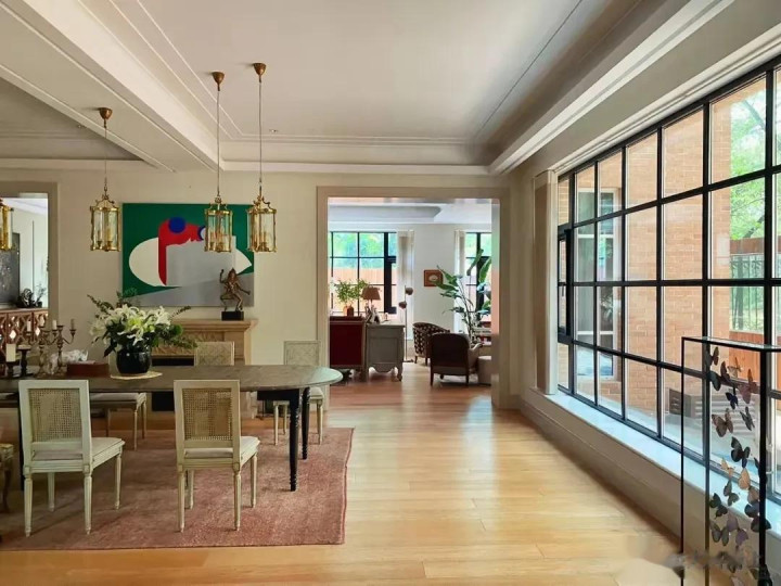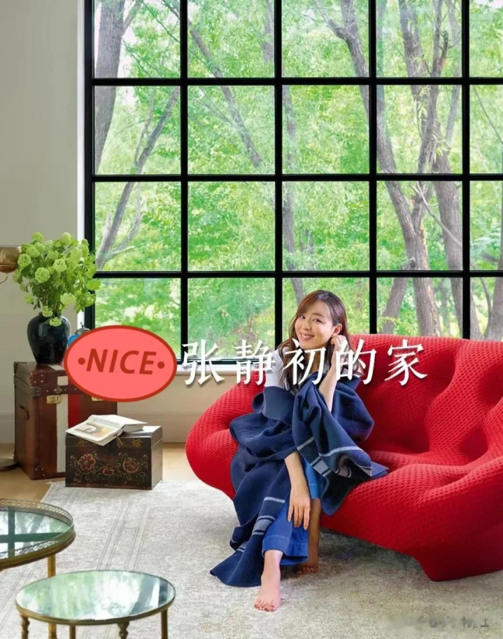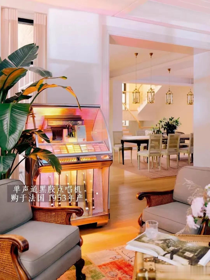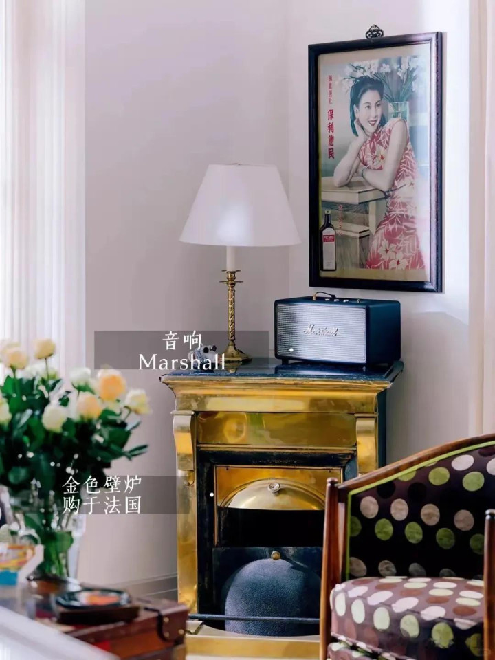 每个房间虽然很大,但却不空挡,这得益于张静初对角落的精心布置;客厅一角,金色的法式壁炉很有格调,壁炉上摆放着的老式音响,和墙壁上挂的民国女画像,很有时空感和年代感。