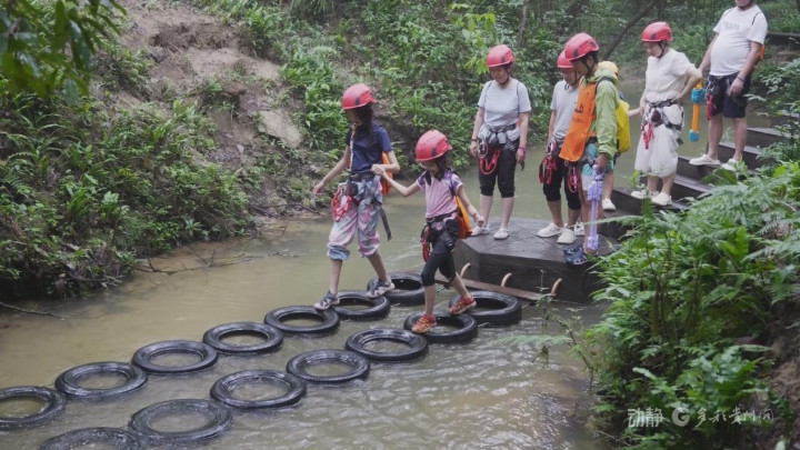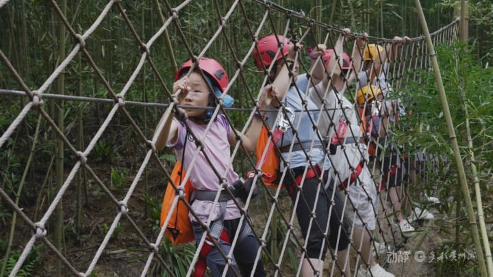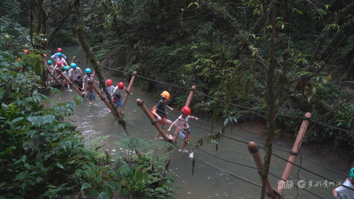 荔波小七孔世遗探险部落项目里,一群“小探险家”正与家长手拉手,踩着清凉浪花溯溪而上。专业教练化身“自然老师”,将亲水之旅变成“行走的自然课”。