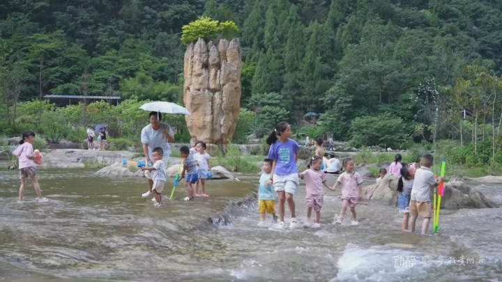 黔南布依族苗族自治州长顺县神泉谷景区今年开辟了亲子亲水区。孩子和家长们在水中嬉戏玩闹。玩累了还可以观看景区特别推出的儿童戏剧表演。傍晚,无人机烟花秀点亮夜空,让快乐持续一整天。