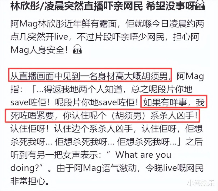 香港知名歌手林欣彤已多日没有露面,而就在24日凌晨,她突然开直播对着镜头大喊大叫,情绪失控。并指控一胡须男要害自己。在一顿语言输出后,直播中断。