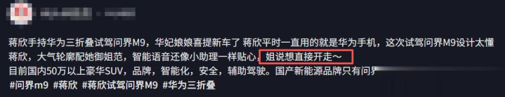 据悉蒋欣相中的车型就是如今很火的问界M9。