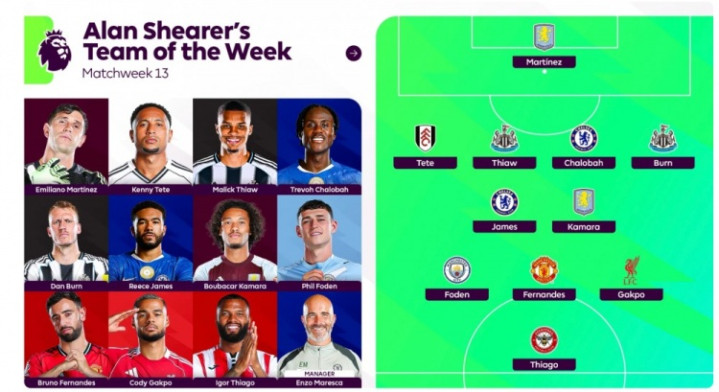 希勒评本轮英超最佳阵: 马雷斯卡、里斯-詹姆斯、B费、加克波入选