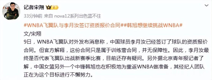 北青记者宋翔发文表示:中国女篮另外一个中锋韩旭也在积极地为重返WNBA做准备,其经纪人团队正在为这个目标进行不懈努力。