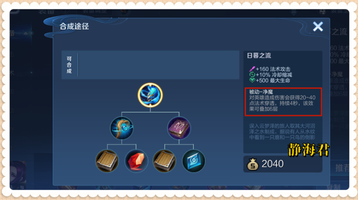 理论上我们可以通过日暮之流获得240点的法术穿透效果,比破茧之衣还高90点。如果出它的话,就只有张飞、元坦等少数坦克英雄的法抗还能稍微看一下。