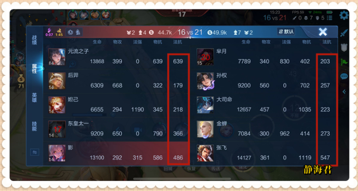 在游戏进行到第16分钟左右的时候,10名英雄法抗最高的是元坦的639,其次是张飞的547,另外甚至还有6名英雄的法抗只有200左右。