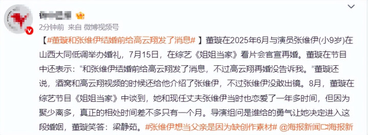 8月16日,《姐姐当家》最新一期播出,董璇在和佟丽娅等好友一起聊天,说起来她再婚一事,董璇大大方方的表示,自己再婚的时候告诉高云翔了,给他发微信了,但是高云翔再婚的时候并没有告诉她。