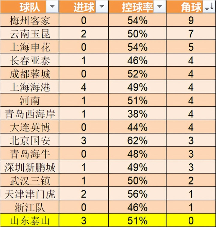 3.本轮山东泰山获得的角球数量是0个,中超倒数第一!