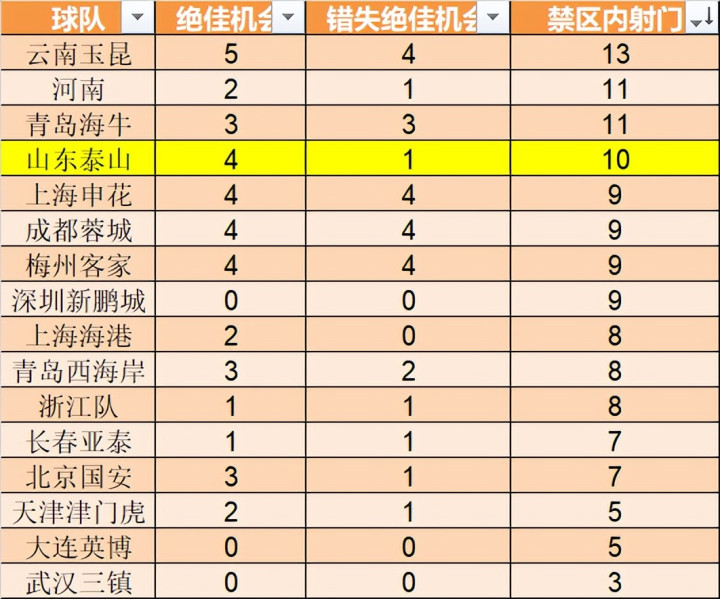 13.本轮山东泰山队获得了4次绝佳机会,排名中超第二!