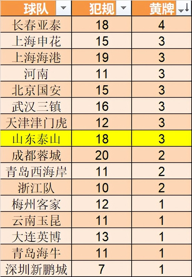 9.山东泰山本轮没有得红牌,但获得三张黄牌,排名中超第三!