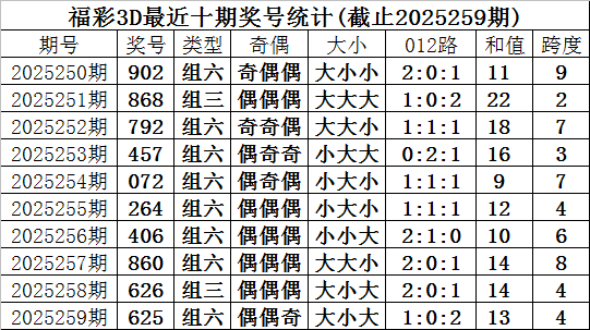 开奖回顾:福彩3D第2025259期奖号为625,奖号形态为:组六、大小大、1:0:2、偶偶奇。