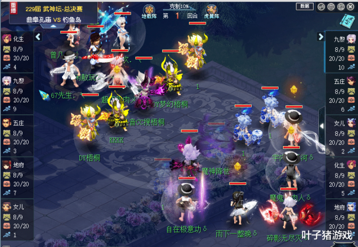 51回合,钓鱼岛谛听观照击倒曲阜孔庙化生,让曲阜孔庙失去了回复能力,眼看曲阜孔庙即将团灭,60、61、62回合,曲阜孔庙分别用无魂、发瘟匣、六道无量限制住了钓鱼岛的九黎,坚持到了化生寺站起,此时钓鱼岛五庄、地府、女儿宝宝已经归零,只能眼睁睁的看着曲阜孔庙回复起来。