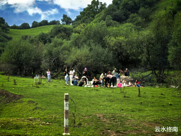 或者往下走一点儿,沿路都有草甸,很多人都选择在这里停歇。这里还有牵着马做骑马生意的人,30起价,人多还可以谈谈,说好价格还是很客气的。