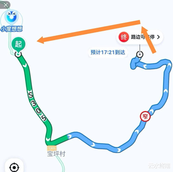 到梁顶看到左上角那个牌子会出现一个岔路口,左手的路就是从宝坪村上来的,我们刚才没有走的橙色箭头路口过来。