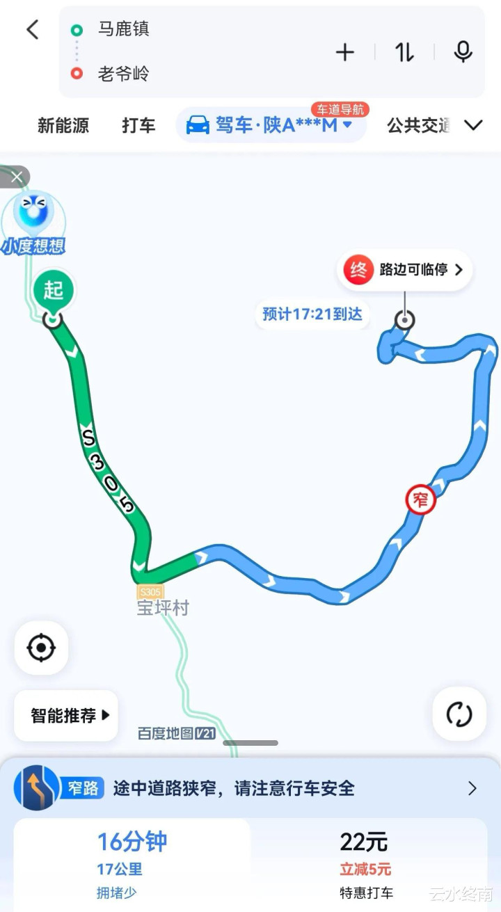 很多人介绍路线很神秘,其实直接导航老爷岭就行了,肯定是途径马鹿镇的宝坪村,这条路从省道拐入水泥路,路挺宽的路况不错,中间有个便道,你跟着导航10分钟多一点就能到山梁上。